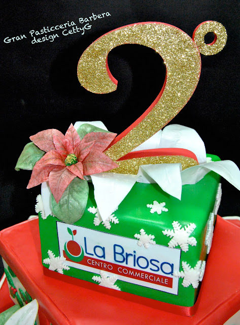 Per questo 2° Anniversario una torta degna di un centro commerciale!! tanti pacchi regalo per tutti. Tre piani di torta una  bontà ...tutta decorata in pasta di zucchero e per l'occasione stelle di Natale in Wafer paper!! buone compere a tutti.